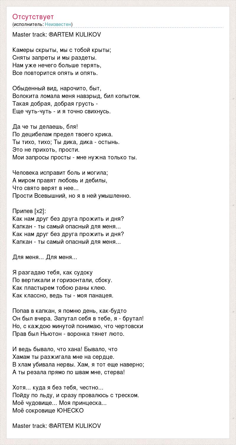 Капкан (Мот) - скачать в Mp3 и слушать онлайн бесплатно Как ты там? Nebezao, Андрей Леницкий. 03:20. Текст песни Мот - капкан перевод, слова песни, видео, клип Я разгадаю тебя, как судоку По вертикали и горизонтали, сбоку. Как пластырем тобою раны клею. Как классно, ведь ты - моя панацея. Попав в капкан, я помню день, как-будто Он был вчера. Запутал себя в тебе, я - брутал! Но, с каждою минутой понимаю, что чертовски Прав был... Мот - Капкан (премьера клипа, 2016) - YouTube О сервисе Прессе Авторские права Связаться с нами Авторам Рекламодателям Разработчикам... Текст песни Капкан - MOT язык Русский | MuzText.com Для меня... Я разгадаю тебя, как судоку: По вертикали, горизонтали, сбоку. Как пластырем тобою раны клею. Как классно, ведь ты - моя панацея. Попав в капкан, я помню день, как будто. Он был вчера. Запутал себя в тебе, я - брутал! Но, с каждою минутой понимаю, что чертовски.